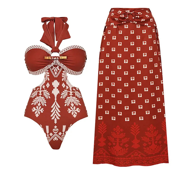Bamboo Buckle Halter Cutout Retro Print One Piece Swimsuit and Skirt